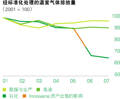 2007年,我们在运营中的温室气体排放量为 63.5 MteCO2e (百万吨CO2当量)。经标准化处理的温室气体排放量与2006年相比有所改善:我们的化工业务部门实现3%的改善,炼油部门实现0.7%的改善,上游业务部门则与去年持平。 非温室气体排放、向水体排放和废弃物总量与2006年水平相比有所减少。
