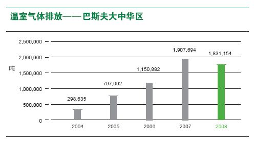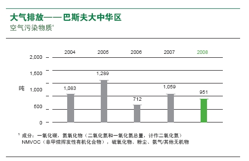 空气污染物包括无机化合物,如一氧化碳(CO)、硫氧化物(SOx)、氮氧化物(NOx)、氨、粉尘、重金属和非甲烷挥发性有机化合物。2008年,巴斯夫大中华区在生产中产生的空气污染物为951吨。与2007年相比,在产量增长的情况下,污染物的排放却减少了10%。 2004-2008年间,空气污染物的排放显示出一些波动。究其原因,源于我们在大中华区业务的发展。并购与启动新工厂使得排放量有所上升。例如我们位于南京的扬子石化-巴斯夫有限责任公司全新的一体化基地于2005年正式启用。而与此同时,工厂实施的各项技术改造和资产剥离则降低了排放量。比如,我们在一家工厂用天然气取代了煤作为燃料供应,从而降低了空气污染物的排放。在这些措施的综合作用下,虽然我们极大地拓展了业务经营,但是2008年的气体排放却与2002年几乎保持在同一水平。我们承诺继续贯彻工艺的技术创新,以实现降低总排放的目标。