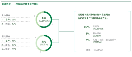 降低能源消耗并因此减少排放的最重要的手段是提高能源效率,即每吨产品的基本能源消耗(燃料、电力、蒸汽等)。2002-2008年间,我们在大中华区将能源效率提升了50%。例如我们位于南京的一体化基地使用热电联供一体装置(CHP装置),通过联合循环燃气轮机实现高达近90%的能源效率。这个CHP装置是巴斯夫全球16个同类装置之一。这些装置与其他6家由外部合作伙伴经营的CHP装置一起为巴斯夫的全球生产与经营提供电力和蒸汽。此外,南京的一体化基地将系统内不同生产装置的能源需求进行智能化整合与统筹。根据我们“一体化”的理念,生产过程中产生的废热不会直接排放到环境中,而会被其他装置所利用。巴斯夫所有主要生产基地均遵循这一原则。巴斯夫大中华区使用天然气、液化石油气(LPG)和石脑油等高效能源,保持平衡的能源构成。