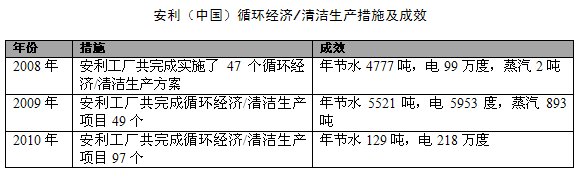 节能减排。2010年,安利工厂制定了2011年节能减排目标:推进清洁生产和循环经济项目,至少100名员工参与清洁生产培训,至少完成20个清洁生产/循环经济项目;建立ISO14064温室气体盘查体系,完成安利(中国)温室气体盘查报告。