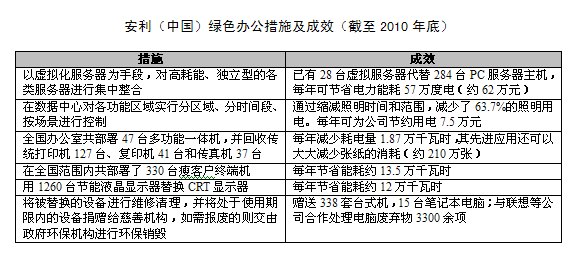 废弃物循环利用。安利公司回收再用了70%本应倒入垃圾场的废弃物,其中包括电脑、显示器等电子垃圾。预计到2012年,这一数字将提高到95%。