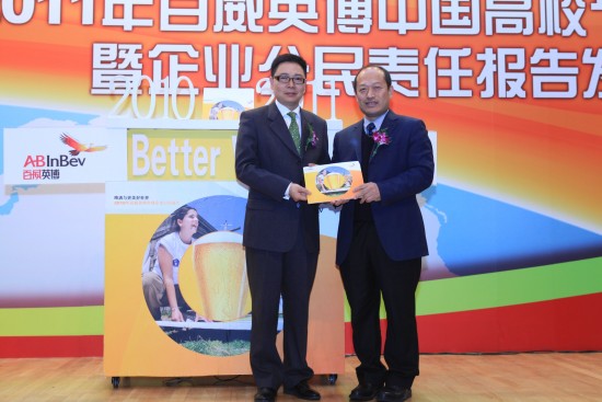 公民社会图片-百威英博亚太区副总裁王仁荣向环保部宣教中心主任贾峰递交“2010百威英博全球企业公民责任报告”