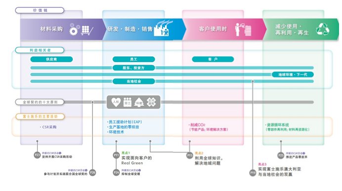 富士施乐整理了所有业务阶段(价值链)的主要CSR活动,从材料的采购到产品的回收、再利用和处置,并将其制成了一览表。今后富士施乐也会将整个价值链视为本公司的责任范围,开展为社会创造价值的活动,为本公司及社会的可持续发展做出贡献。