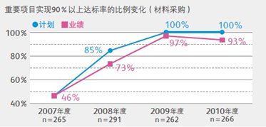 在材料采购方面,富士施乐的目标是,在重要项目(57个项目)上,所有供应商的达标率至少在90%以上。然而,由于有些新的供应商未能达到这个比例,所以达标率比上一年度有所下降。在支援供应商方面,富士施乐分别在东京、深圳、上海举办了高层研讨会,同时派专家小组(由人力资源部、法律部、CSR部、采购部人员构成)访问达标率高的日本企业,学习最佳实践经验,并为广泛推广到其他供应商做准备。
