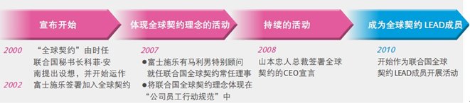 2010年度,富士施乐最高管理层的承诺和积极姿态受到了好评,公司被邀请成为联合国全球契约新项目组--LEAD的新成员,该项目组由全球55家可持续发展先进企业组成。富士施乐还将联合国全球契约作为有效人际网络,并在这一平台上学习世界最佳的CSR实践,推进富士施乐的CSR活动。