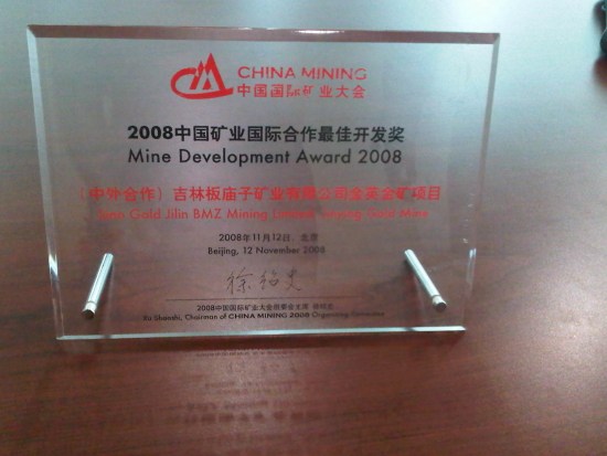 2008年吉林白山金矿‘最佳国际合作开发将’