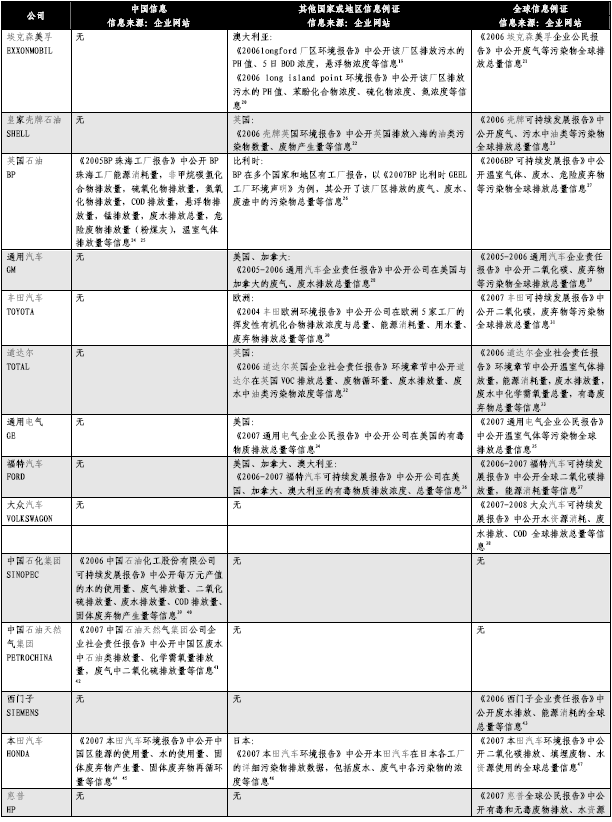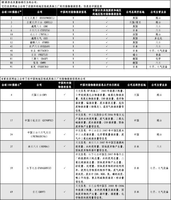 3、 而且,在22家未公布中国污染物排放信息的企业中,有13家企业在污染物排放信息公开方面对中国有双重标准的行为:它们在其网站上公开了在中国以外其他具体国家或地区的污染物排放信息,但是没有公布其在中国的污染物排放信息。这13 家企业是:埃克森美孚、皇家壳牌石油、通用汽车、丰田汽车、道达尔、通用电气、福特汽车、日产汽车、日立、雀巢、巴斯夫、宝马、东芝。