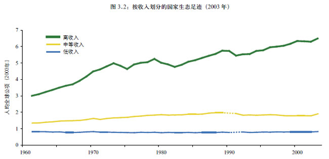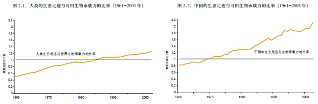 人类对大自然的需求可以和地球的生物承载力——具生物生产力土地面积可以满足人类需求的量——相比较。2003 年,地球生物承载力为112亿全球公顷,即人均1.8 全球公顷。然而,生态足迹在全球各个地区间有很大差异。北美和西欧的许多高收入国家的人均生态足迹最大,2003 年,中国的人均生态足迹是1.6 全球公顷,在147 个国家中列第69 位。对于高收入国家和中国,碳足迹占据了总生态足迹一半左右。