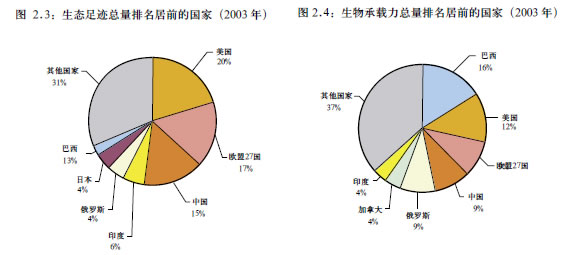 · 美国,欧盟和中国占世界全部生态足迹的50%,占有30% 的全球可用生物承载力。各政府和社会所做出的决策在很大程度上决定这个世界是否能满足新世纪的可持续发展挑战。