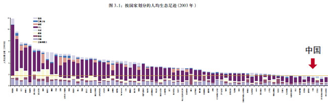 · 就个人而言,中国2003 年的生态足迹是人均1.6 全球公顷,位居世界第69 位,低于全球人均的生态足迹2.2 全球公顷。