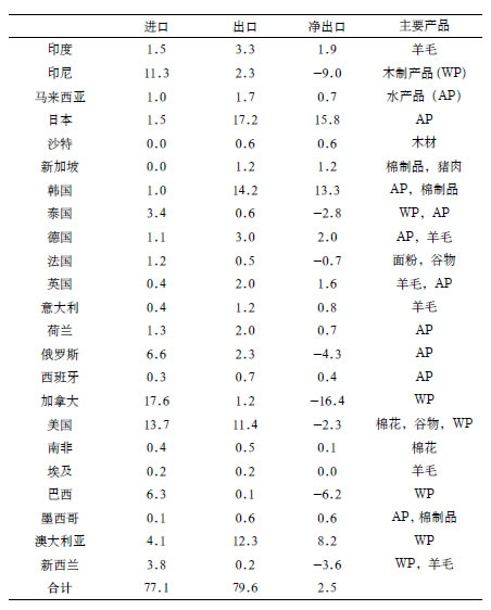 ■ 国际贸易再分配:进口的产品作为生产的中间输入,转化到其他产品之中,然后再出口供其他国家与地区消费。例如,中国从澳大利亚与新西兰进口羊毛,然后加工成毛纺制品出口给美国、日本。中国的贸易格局主要属于此类:进口初级产品,出口加工制成品。