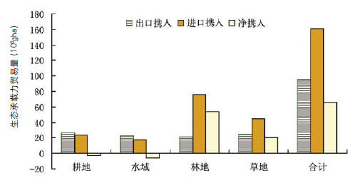 中国国际贸易以进口初级产品与原材料(如木材)、出口制成品(如纸张、家具)为主要特色。2003 年,联合国研究指出,中国进口贸易携带的生物承载力总计480×106gha,出口贸易携带的生物承载力总计350×106gha。因此,净进口生物承载力130×106gha,几乎匹敌于德国全国的生物承载力。一定程度上,净进口资源保障了中国在生态赤字下运转。在核算中国贸易输入、输出的生物承载力时,主要考虑进出口的大宗货物。在本研究中,包括谷物、大豆、棉花、羊毛、蔬菜、水果、水产品、畜禽肉、木材以及它们的制品。在本初步分析中,尚未涵盖国际贸易携带的碳排放足迹,其在进口贸易中约占进口总生态足迹的一半,在出口贸易中约占总出口生态足迹的三分之二。