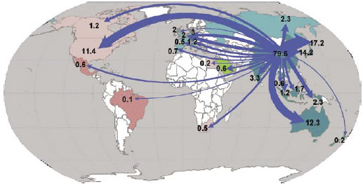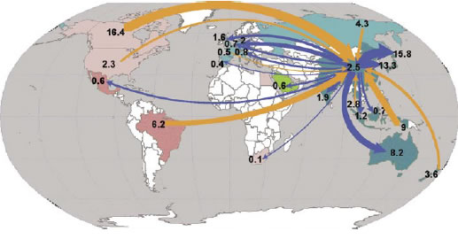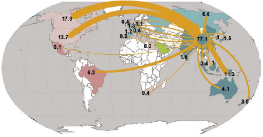 图7.1: 中国生物承载力的国际贸易流动(2004 年)