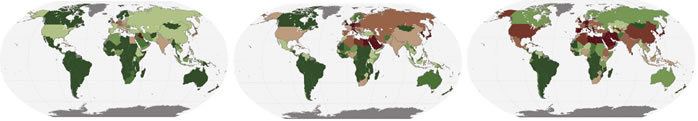 图8.1 生态负债国和生态债权国1961, 1982,2003 年 生态负债国用红色标示,生态债权国用绿色标示。1961 年,147 个国家中仅有26 个是生态负债国, 但是到2003 年,90 个国家出现了生态赤字。