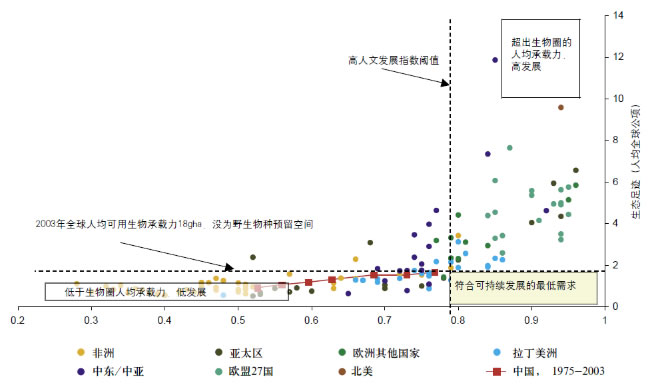 联合国开发计划署(UNDP)认为一国的人类发展指数超过0.8 就是高人文发展水平。人均生态足迹低于1.8 全球公顷全球——全球人均可用生物承载力,意味着这个国家的生活方式可以在全世界范围内持续复制。可持续发展要求世界在平均水平上满足这个要求,右下角的蓝色区所示。就地区而言,在2003 年,亚太和非洲需求低于人均1.8 全球公顷,而欧洲和北美的人类发展指数高于0.8。世界上任何地区和全世界总体都不满足可持续发展的标准。在国家水平上,根据其向联合国提交的报告,拉丁美洲的一些国家接近可持续发展。在过去的40 年里,中国的人文发展指数快速增加,相应人均生态足迹中度增加。中国现在正处于选择的交叉点上:他们做出的经济优先选择是不是在促使高发展的同时而没有导致高的生态足迹?这种发展会使中国在全球生态超载的情形下更加强大。而寻找这一道路需要认真计划和管理。中国的未来和世界生态系统取决于中国在未来的几十年里做出的决策。