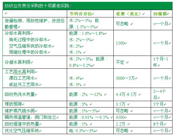 你知道一个2毫米的蒸汽管道漏洞在一年之内可能导致相当于约10吨煤的能量损耗吗?如果将一个工厂内所有的小漏洞加在一起,你将发现其造成的资源和金钱的损耗是相当可观的。专家预计,通过实施泄漏检测和预防性维护计划,纺织厂可减少高达10%的资源使用量。 加大对清洁工作用水的监管力度也能节约等量甚至更多资源,例如在不常用水时注意关闭水龙头。通过对工厂进行评估工作时的现场观察,RSI保守估计泄漏的水和蒸汽约占水和煤损耗量的1%~5%。而事实上,若根据相关文献材料中的数据判断,这些值可能会更高。例行查找水、蒸汽和压缩气体的泄漏源并实施有效的预防性维护计划的方案几乎不需任何投资成本,可立即回本。