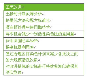 具有相同或更大改进潜力的方法还包括工艺优化:即通过改变预处理和染整工艺方法来减少水、能源和化学品的用量。例如,改用化学品用量少和洗涤次数少的工艺。或是加强工厂生产规划以便将机器闲置时间压缩到最短。最可取的办法也许是提高染色的一次成功率,这不但有助于提高盈利和按时交货能力,而且可以大大减少因织物染色返工而造成的再次环境污染。管理者可以通过内部项目组或寻求外部专家和顾问的帮助自行考察工艺优化的效果。无论用何种方法,以下8项相对容易的入门建议有助于工厂开始进行调查和改进。