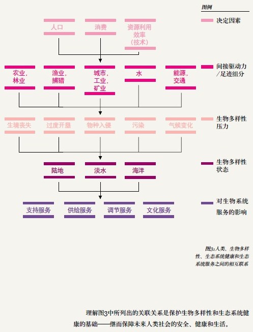 在很大程度上,以上的威胁来自于人类对食物、水、能源和材料的需求,以及对城镇和基础设施占用空间的需求。这些需求主要由一些关键的部门来满足:农业、林业、渔业、矿业、工业、水和能源。这些部门一起构成了生物多样性丧失的间接驱动因素。他们对生物多样性影响的程度大小由以下三方面的因素决定:消费者或者人口数量;人均消费量;以及自然资源转化为物品和服务的效率。生物多样性丧失会导致生态系统处于高压状态或者发生退化,直至生态系统的崩溃。这威胁着生态系统服务的持续供给,反过来又威胁着生物多样性和生态系统健康。至关重要的一点是,人类社会对生态系统服务的依赖所导致的生态系统服务的丧失 ,严重威胁着地球上所有人类未来的生活和发展。