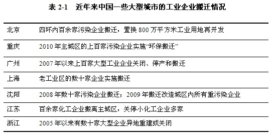由于土壤污染具有滞后性,而且过去在土壤污染物的识别和监测中也存在诸多困难,这都使得土地污染问题在过去受到关注较少。工业企业搬迁遗留遗弃场地是近年来中国城市化进程加速的产物。污染企业搬迁在各大中城市得到了大力实施,如海河流域的北京和天津、东北老工业基地、长江三角洲和珠江三角洲(见表2-1)。