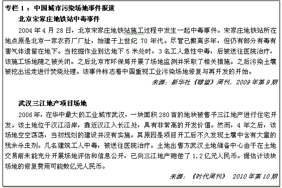 近年来在快速城市化和污染土地再开发过程中,发生了一些严重的土地污染事件(见专栏1)。其中有些事件经过媒体报道,引起了公众的关注(北京市宋家庄地铁工程施工工人中毒事件)。 “宋家庄事件”发生后,原国家环保总局2004年发出通知,要求各地环保部门切实做好企业搬迁过程中的环境污染防治工作,一旦发现土壤污染问题,要及时报告总局并尽快制定污染控制实施方案。