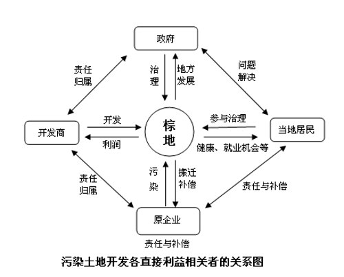 污染土地再开发利用过程中,利益相关者包括直接利益相关者和间接利益相关者。直接利益相关群体主要包括以下几种:当地政府、社区居民、企业和开发商。间接利益相关群体包括:金融机构(银行等)、研究机构、仲裁或诉讼机构、媒体、社会公众、后代、生态保护组织、非政府组织等。各直接利益相关方之间的利益与责任关系见图5-3。以当地政府和开发商的关系为例,棕地往往位于城市中心地带,占据着商业价值较高的黄金地段。中国虽没有对污染土地的开发做出详细规定,但是国家积极引导对废弃地的开发,提倡土地资源的集约利用,这一宏观政策降低了开发商的投资风险。污染土地的开发也为社会创造了新的就业机会,激发社区活力,减少了污染土地对居民健康的威胁,有利于构建和谐稳定的社会。因此污染土地的开发对区域及城市社会经济发展和居民生活具有重大意义。