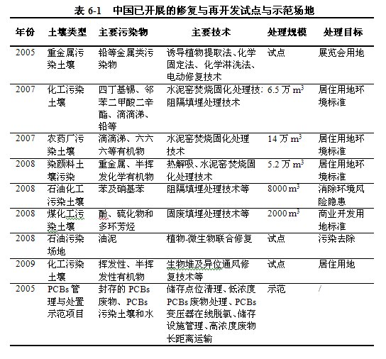 中国目前已开展的修复与再开发试点与示范场地尚为数不多(见表6-1),已开展的场地修复工作大多是在充分借鉴国外相关经验的基础上,国内有关机构联合国外环保公司和科研机构共同完成。已开展的场地修复类型已基本涵盖了目前已知的主要类型,如化工场地、采矿业和冶金业场地、石油污染场地、农药类场地和电子废弃物场地等。除了比较成熟的异位处理处置技术外,还有相当一部分修复技术与设备在研究开发之中,如生物修复技术和气相抽提技术等,特别是一些原位的修复技术,都还处于试验和试点示范阶段。国内先行开展试验与示范项目的城市有北京、上海、重庆、浙江、江苏和沈阳等。