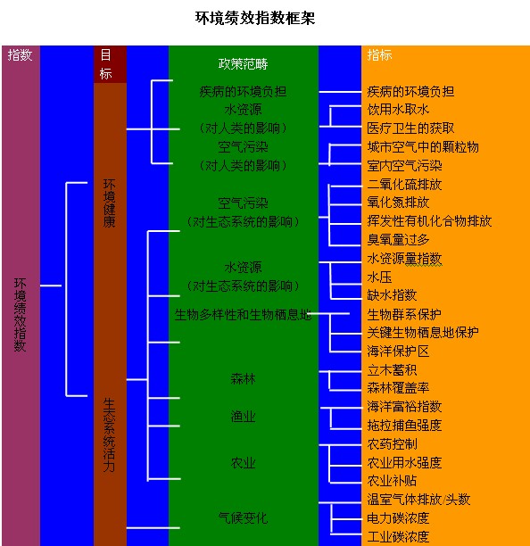 《2010环境绩效指数(EPI)报告》对163个国家的25个绩效指标进行了排名,这25个绩效指标涉及10项政策范畴,不仅包括公共环境健康,还涵盖生态系统活力。这些指标衡量了中央政府层面上国家与设立环境政策目标之间联系的紧密程度。这种渐进的目标方法有助于进行国家间的对比,也分析了全球社区在特定的政策问题上的合作。