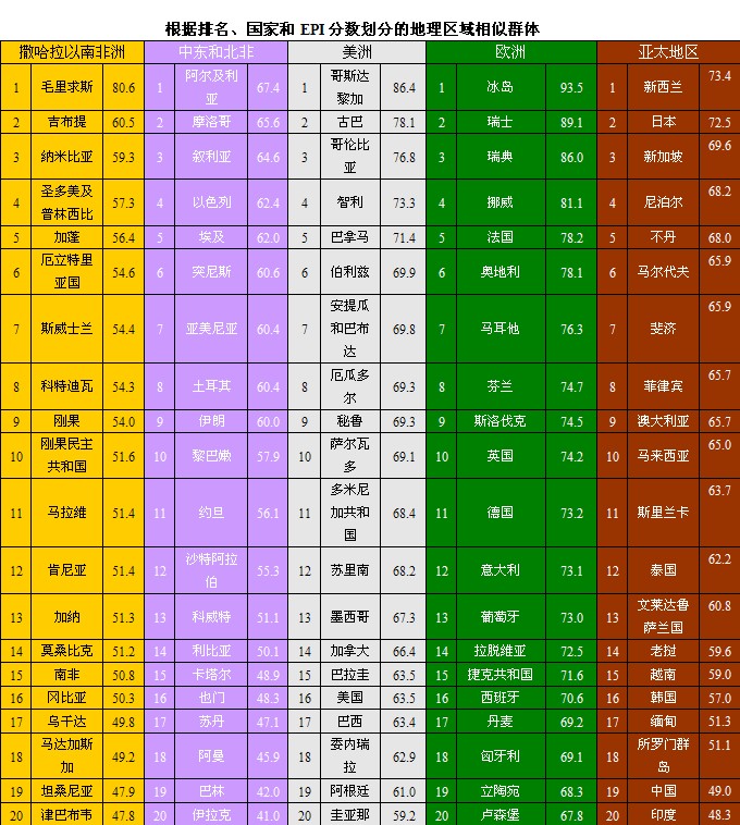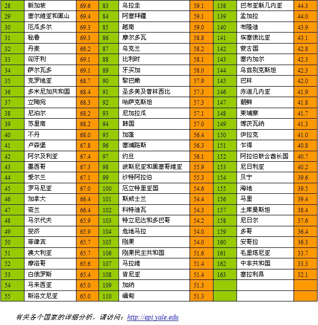 环境绩效指数(EPI)的整体排名只具有象征性意义,它表明哪个国家在面临所有全球性的环境压力下表现最为出色。从政策的角度分析,环境绩效指数真正的意义来源于对数据的深度剖析,根据特定专题、政策范畴、相似群体和国家等进行绩效分析。这种分析可以帮助我们对于政策选择进行定义、理解环境进步的决定因素,并实现政府投资回报的最大化。从更为广泛的角度看,EPI还能为引导各个国家和整个世界实现环境可持续性发展提供有力的工具。