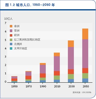 在1950年,只有29%的世界人口居住在城市,人口超过100万能被称为超大城市的也只有纽约和东京。在2010年,城市人口所占世界人口百分比达到50%,大城市的数量达到20个,多数城市人口居住于亚洲和拉丁美洲(图1.2)。城市增长的速率在亚洲和非洲很高(Satterthwaite等 2010),近几十年来增长速率最快的是中等城市(Montgomery 2008)。