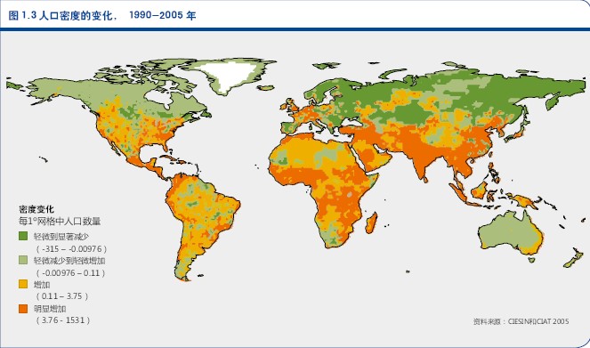 虽然预期到2050年全世界的净人口增长是在世界上最贫穷的城市中(UN 2009b),而全部的土地变化却发生在农村环境中。人类在地球表面留下的最大印迹是将森林转变为农田。目前,世界上37.4%的地表被用来进行农业生产(Foley等2011)。