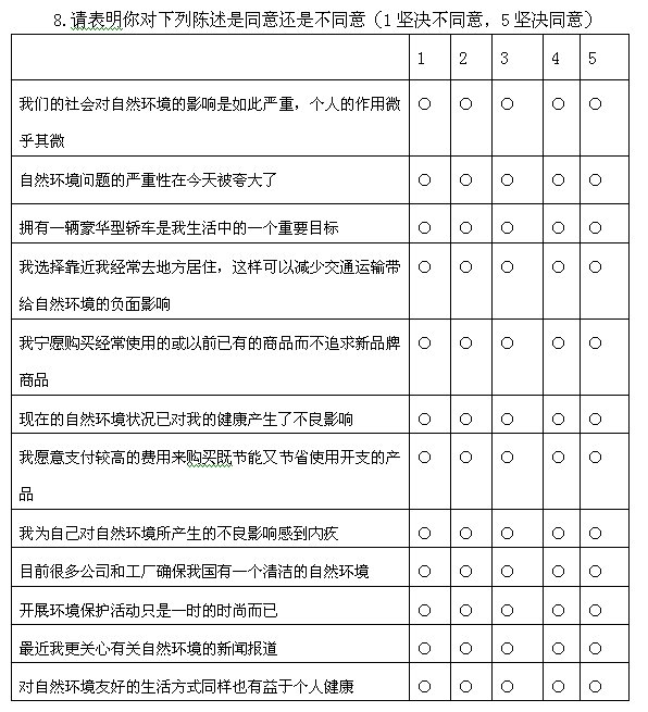 | 为了节能,把家里和办公室里的制冷制热设备设置在较低的度数上 | ○ | ○ | ○ | ○ | ○ |