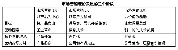 科特勒认为,市场营销理论发展至今经历了三个阶段。第一阶段的市场营销理论即市场营销1.0,是以产品为中心的,企业开发出具备一定功能的产品,然后将产品卖出去就可以了,营销重点是产品功能。第二阶段的市场营销理论(2.0)是以客户为导向的,此时企业要更多地从客户的角度出发,满足客户需求,如果不同用户有不同需求,还要考虑产品和市场差异化的问题。第三阶段的市场营销理论(3.0)是以价值为驱动的(或称价值观驱动),这一阶段的企业有更崇高的目标——让世界变得更美好,营销的重点不是将单个产品推销给客户,而是将公司的使命、愿景和价值观传递给客户,要和客户有心灵层面的沟通,让客户喜欢上公司,然后再身心愉悦地使用公司的产品。